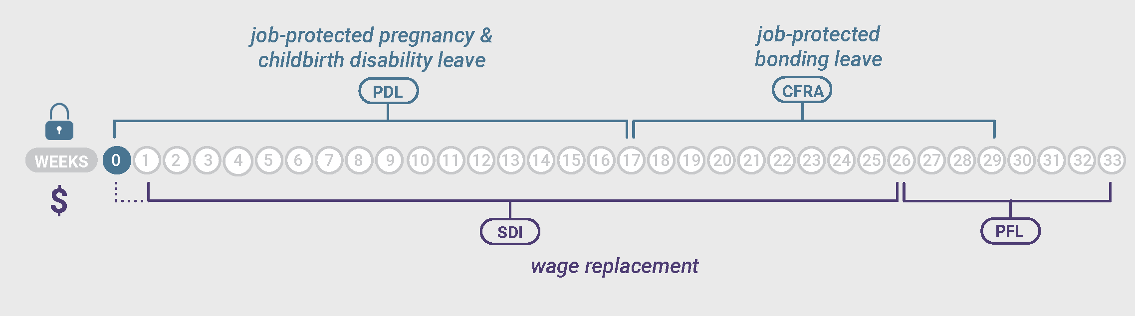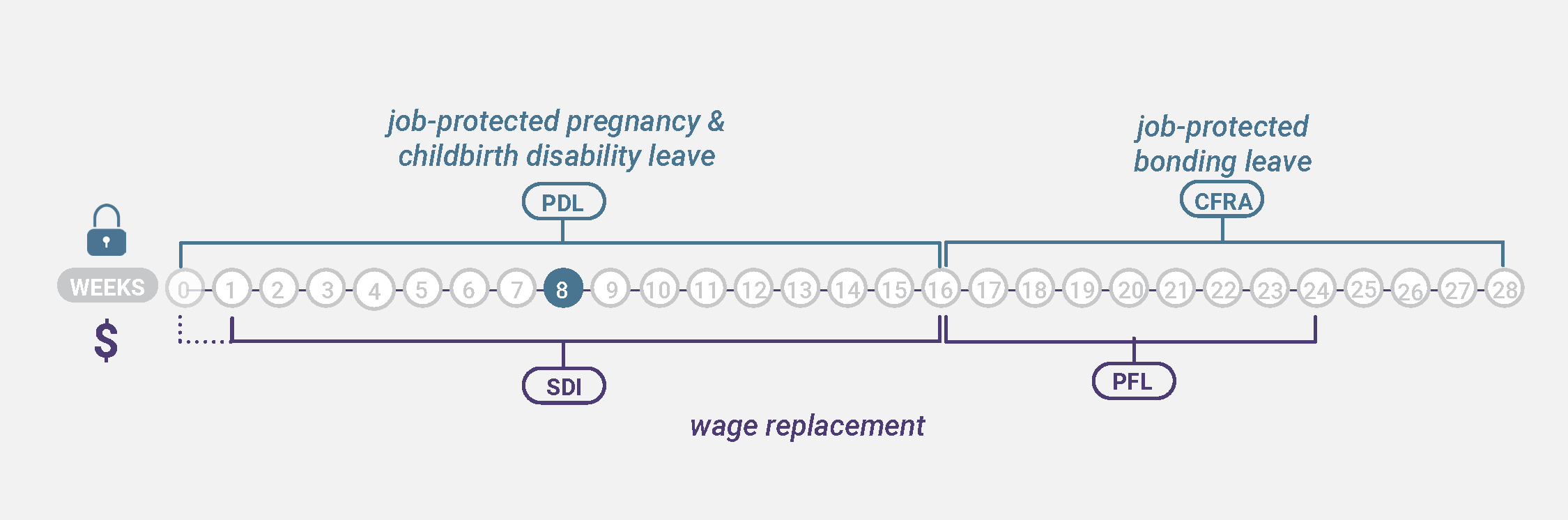Leona’s doctor puts her on bedrest 8 weeks before her due date and she has a C-section. She takes leave for 8 weeks before her baby is born through PDL, 8 weeks to recover from her C-section through PDL, and then 12 weeks to bond through CFRA. She is paid through SDI for 15 weeks (after a 1-week unpaid waiting period) and PFL for 8 weeks once she starts bonding.